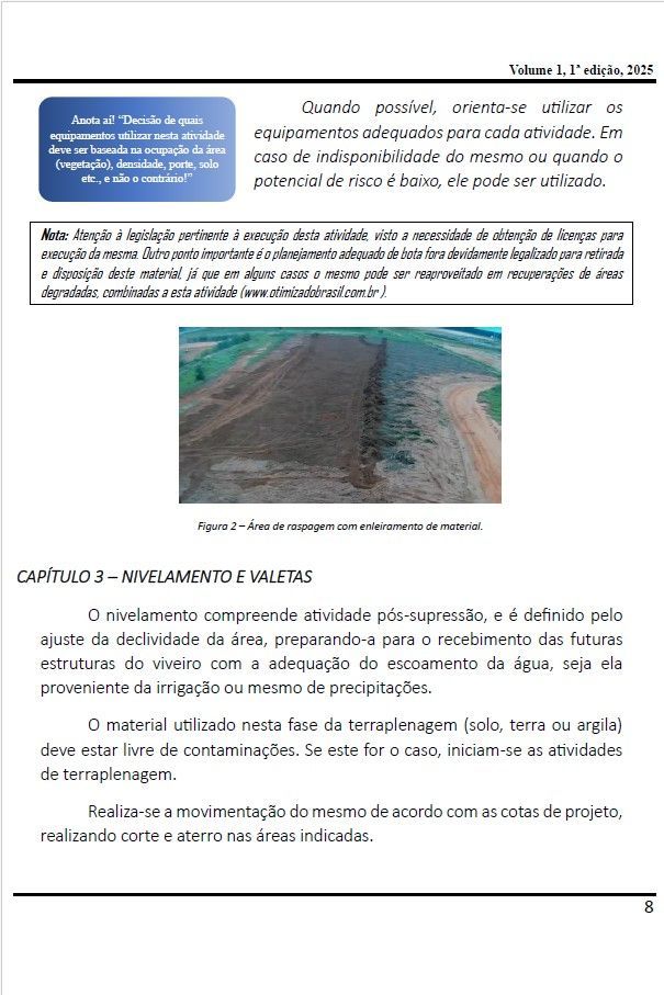 Neste e-book, estaremos dando ênfase ao tema “hidrologia e a terraplenagem inicial para implantação de viveiros florestais”, visto que o autor considera que, na maioria das bibliografias existentes, o foco é dado à construção das instalações e tratos culturais relativos à alta produtividade.